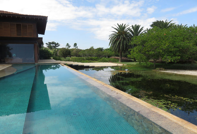 I took the lake as the starting point of the drawing. The garden was designed based on it and everything started to happen around it. The lake's outline began as water that mirrored the sky and the surroundings in the center of the land. Its size on the scale of the place and the height of its location should be the size of the eye, so that the house could be seen in its entirety from wherever one was. Its long shape was born from this premise, and the design gave it a soft organicity. The curved lines of its contour sculpted the internal reliefs to enable deeper niches and shelter more demanding fish. On its edges, the curves created the beach and we meandered through colorful flowerbeds punctuated by trees and grasses tousled by the wind until they met the sapucaia and jaboticabeiras of the orchard. A large and delicate Santa Cecília granite staircase extends over the water, providing a new look.