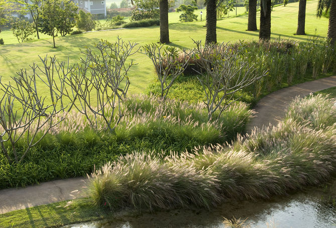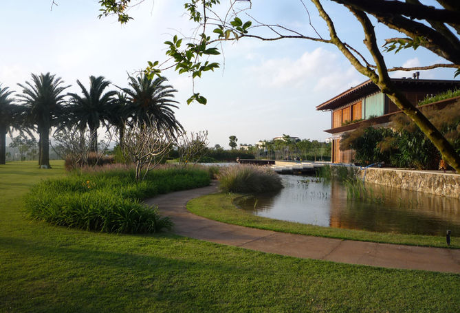 The entire land was surrounded by native trees, which today constitute a forest around the entire area, even protecting the view of the houses at the lowest level. There we planted Anadenanthera colubrina, Aspidosperma polyneuron, Balfourodendron riedelianum, Esenbeckia leiocarpa marking some points of the forest with its size and height, Lafoensia glyptocarpa, Nectandra megapotamica, Schinus terebinthifolia, pink cedar (Cedrela fissilis), Centrolobium tomentosum, Tibouchina granulosa, among many others. Important trees in our forests, such as sapucaia (Lecythis pisonis), jequitibá (Cariniana sp) and Jatobá (Hymenaea courbaril) indicate references. The slope side by side of the main entrance received two large groups of white ipês (Tabebuia roseo-alba) lined up. The slope side by side of the main entrance received two large groups of white ipês (Tabebuia roseo-alba) lined up. In the stands of the sports courts, which were made to contain the steep embankment and at the same time accommodate those watching the games, many yellow ipês (Handroanthus albus) were planted freely on the steps. Next to the courts, a Peltophorum dubium avenue. A group of purple ipê trees (Handroanthus impetiginosus) planted on soft grass terraces meet the pool's stone deck. The ingás (Inga sp), which like water, ended up at the edge of the lake. Two lines of date palm trees (Phoenix dactylifera) were planted in the continuation of the stairs over the lake, at the request of the client, who really wanted to have these palm trees in his garden. Many fruit trees join the jabuticabeiras forming an orchard with different lemons, star fruit, lychee, abiu, mango, avocado, blackberry and others. Right there, beds were created with cobblestones and filleted flooring for herbs and cut flowers. A large group of Calycophyllum spruceanum hugs the entire side of the house on the south side. Large flowerbeds with daylilies, tritoma, neomarica, bulbine, lantana, grasses and agapanthus flank the walkway next to the lake. Shrubs form large masses of noranteas, alamandas, mini Eugenia uniflora, bouganvileas, red pineapple, sofhora, cassias and many more. Next to the technical areas, hills were designed to provide height of land and at the same time provide a more friendly closure to the garden, receiving trees such as Cassia seyal, Erythrina crista-galli, as well as Bauhinias. A dense mass of grumixamas (Eugenia brasiliensis) with their delicious black fruits close the solar panels.